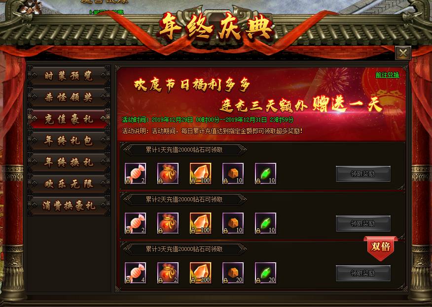 活动内容:活动期间,每日200元即可获得超值奖励及年终糖果,累计参与第三日可获得双倍奖励,每天仅限领取一次(年终糖果可兑换丰富奖励及时装)。