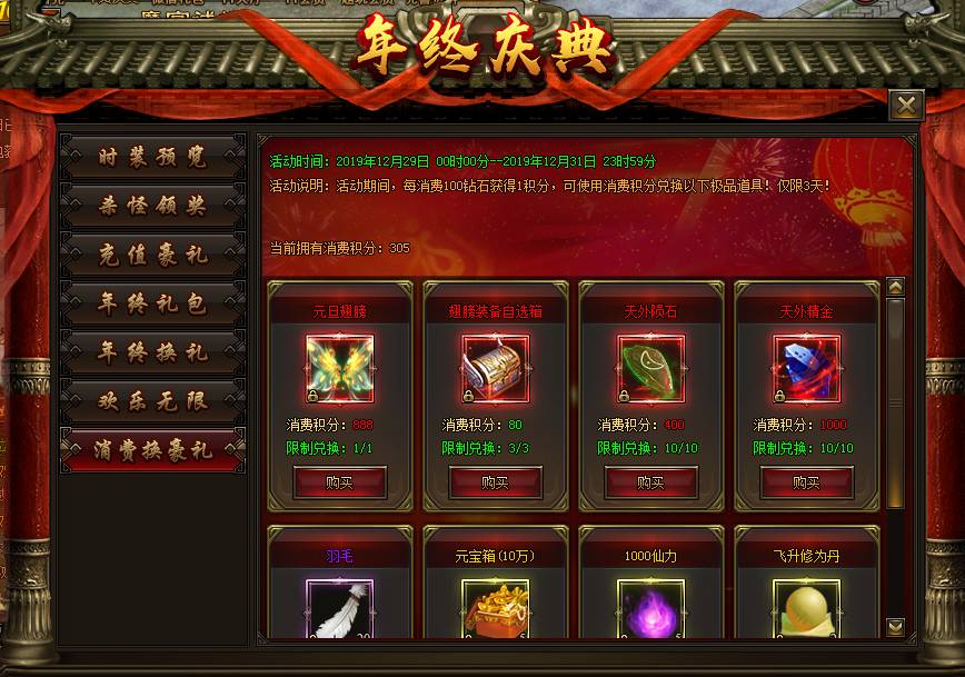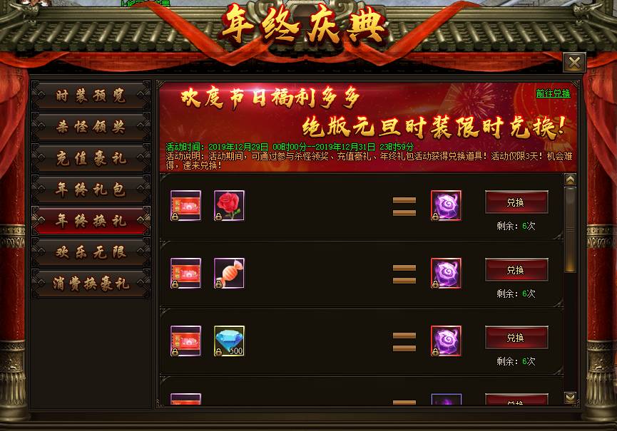 活动内容:活动期间,可通过杀怪领奖、充值豪礼、年终礼包活动获得兑换道具,活动仅限3天,机会难得,速来兑换。