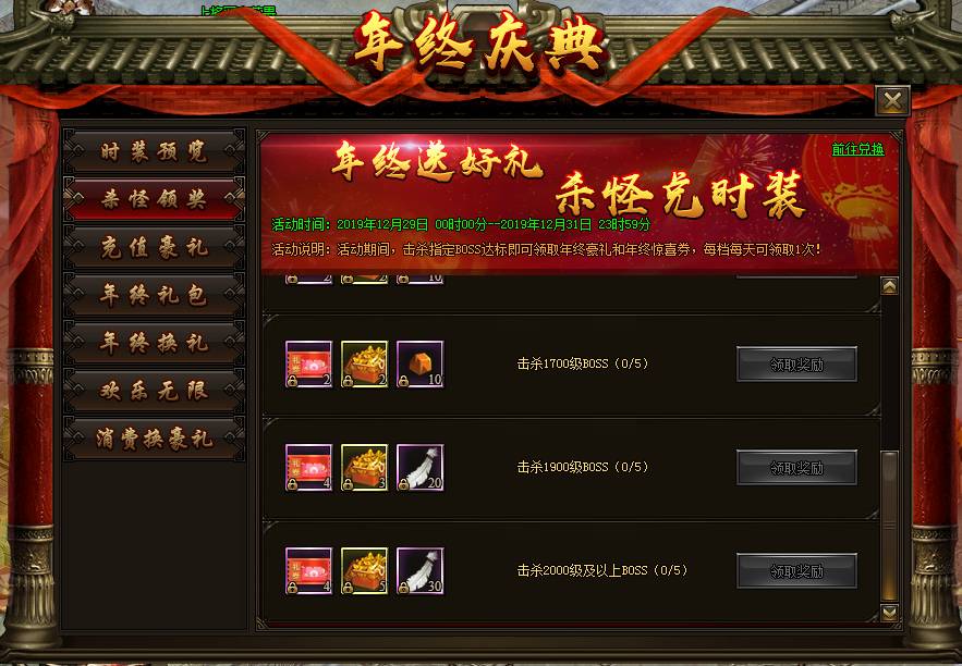 活动内容:活动期间,每日击杀指定等级boss达到要求,即可领取豪华奖励及年终惊喜券,每天每项仅限领取一次(年终惊喜券可兑换丰富奖励及时装)。