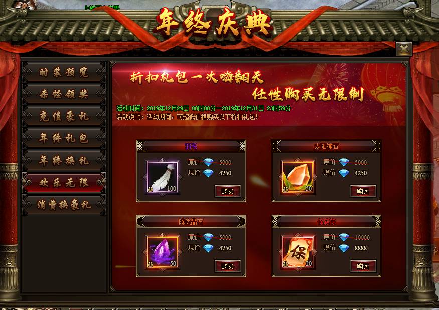 活动内容:活动期间,每日可以超低价格购买各种超值礼包,礼包可无限购买。