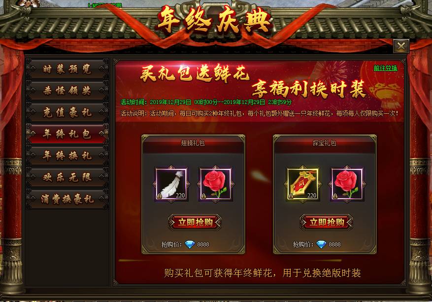 活动内容:活动期间,每日可购买2种年终礼包,每个礼包额外赠送一枝年终鲜花,每个礼包每天限购一次(年终鲜花可兑换丰富奖励及时装)。